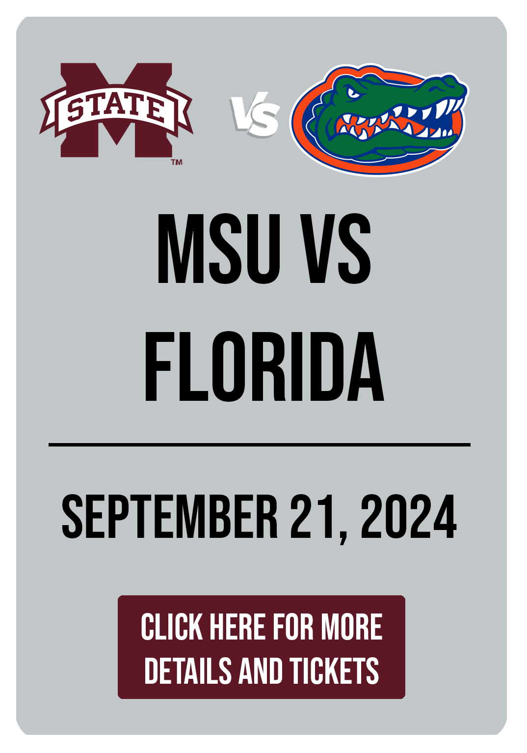 MSU vs Florida Tailgate Location The Mill at MSU: 600 Russell St, Starkville, MS 39759 September 21 8:00 am to 10:15 am